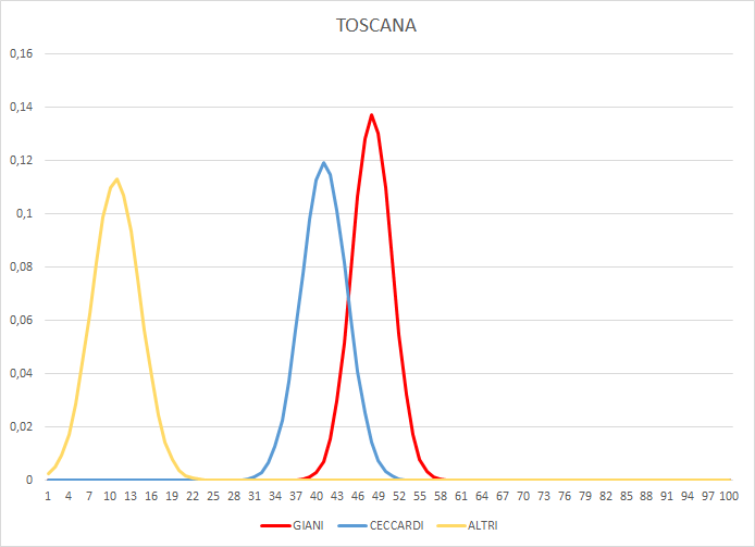 Tra i frequentatori di BidiMedia la Ceccardi raccoglie il 13.2% dei favori, risultato notevolissimo nella regione più rossa d’Italia. Potere della narrativa delle ultime settimane? La simulazione è comunque meno ottimista, ma probabilmente la candidata del centrodestra avrebbe fatto la firma per avere una possibilità su 20 di vittoria (e lo stesso farebbe il centrosinistra in Veneto o Lombardia).