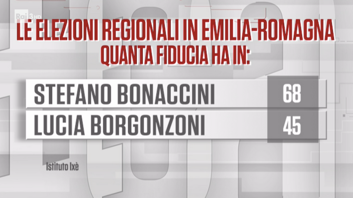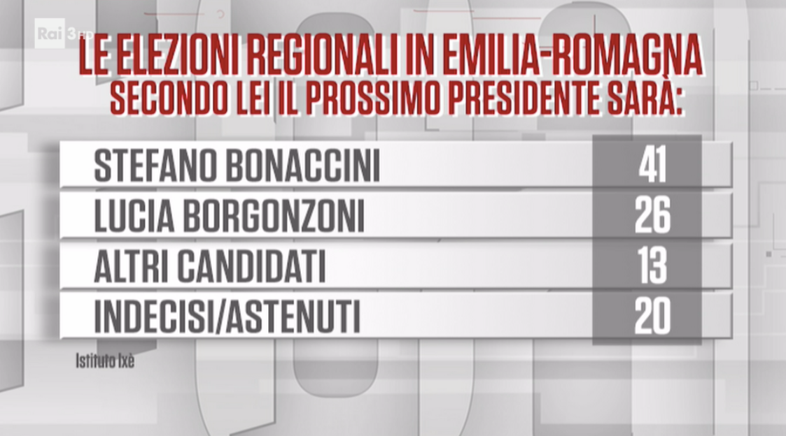 Martedì è andato in scena a Cartabianca il dibattito tra Stefano Bonaccini e Lucia Bergonzoni, principali candidati a presidente dell’Emilia Romagna, in vista delle prossime regionali del 26/1. Nel corso della trasmissione è stato anche proposto il sondaggio Ixè sulle regionali: Bonaccini è in netto vantaggio, mentre risulta in bilico la sfida tra le liste e le coalizioni.