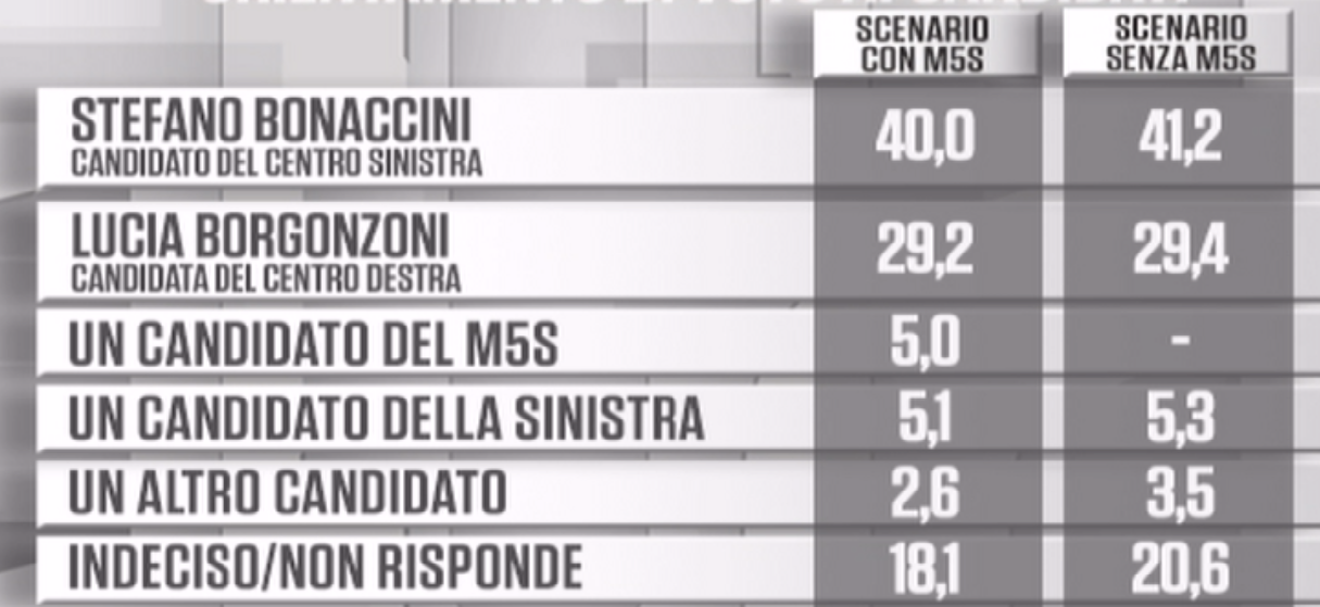 La predominanza di Bonaccini prescinde dalla presenza o meno del M5S, la cui assenza sposterebbe solo pochi punti, e darebbe un ulteriore piccolo vantaggio all’esponente del PD.