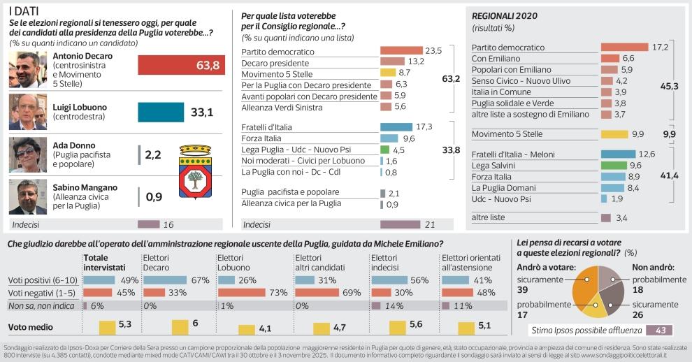 Regionali Puglia – Sondaggio Ipsos: Decaro a +30 su Lobuono, PD primo partito