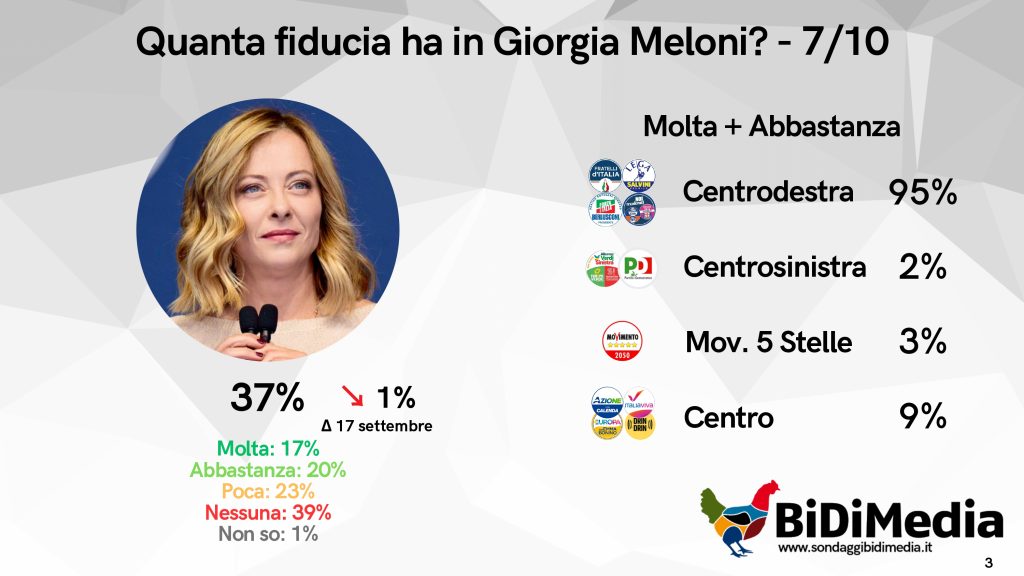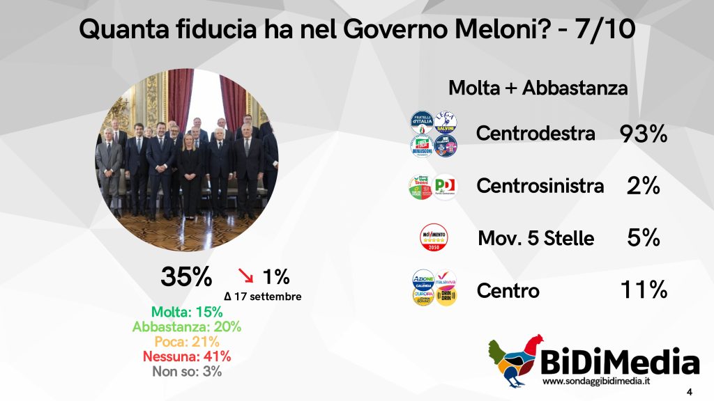 Se le intenzioni di voto mostrano una situazione stabile/tendente al rialzo per il Governo, la fiducia segue una direzione opposta. Sia la fiducia in Giorgia Meloni che nel suo Governo cala di un punto, rispettivamente al 37% e al 35%