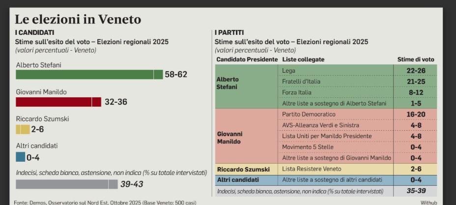 Sondaggio Demos – Veneto: Stefani (CDX) nettamente avanti con il 60%. Lega (con Zaia) avanti a Fratelli d’Italia