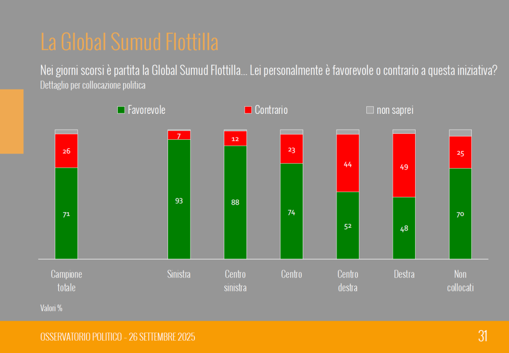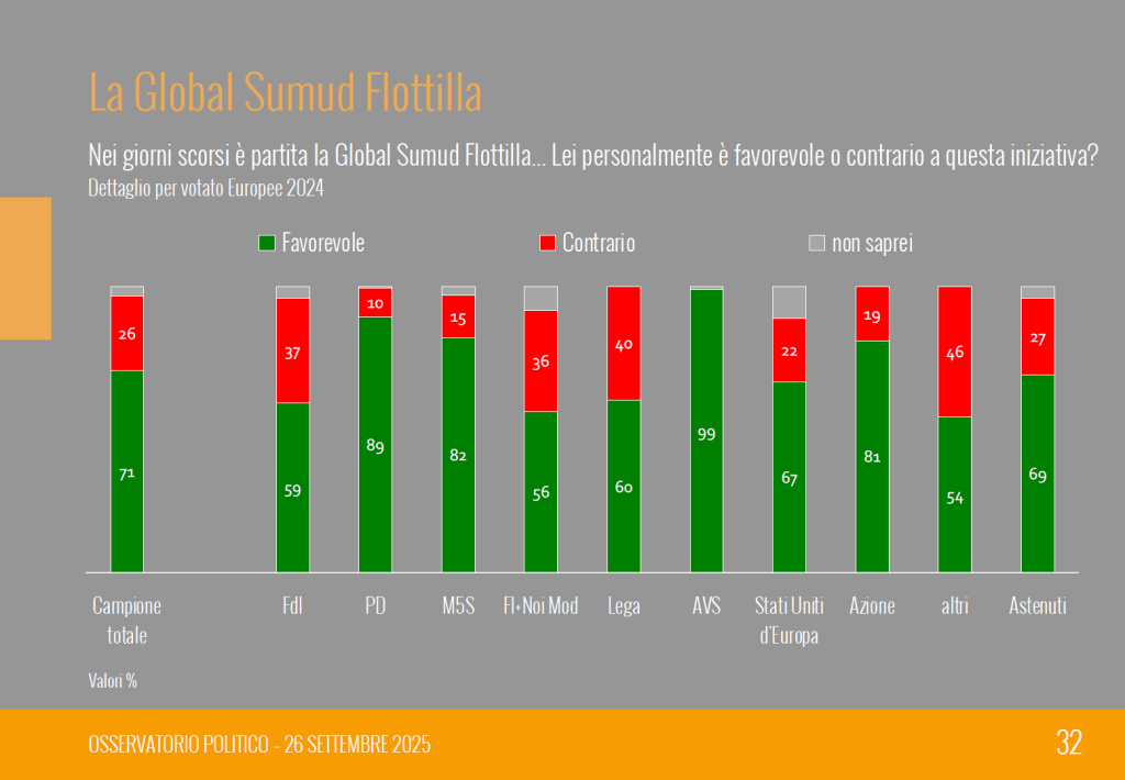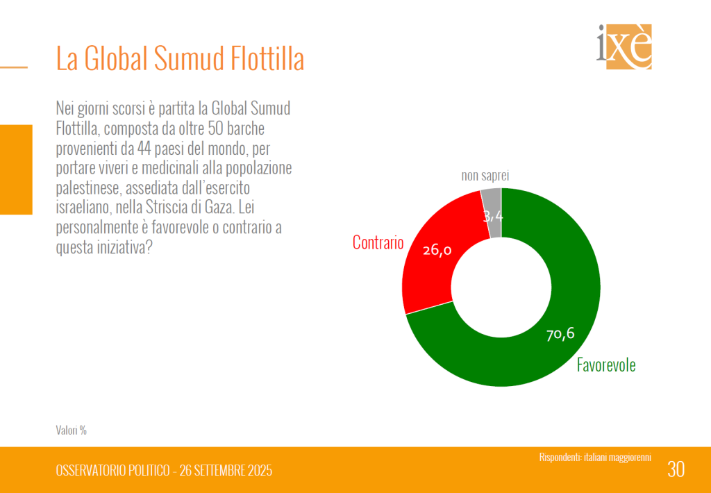 Sondaggio Ixè: il 70% degli italiani è con la Global Sumud Flotilla. Anche in FDI e Lega i favorevoli sono maggioritari
